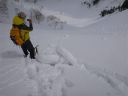 | 先行者の踏み跡、スキーのスプールなどを活用できても、膝上までの新雪の中を歩くのは大変なことだ。 |