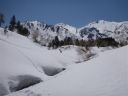 | 思いのほか早く、内蔵助谷出合に下りついた。見ると下の廊下へ向かう木の橋が左岸に出ている。融雪も思いのほか早かった。 |