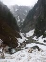 | 内蔵助谷出合に黒部ダム登山者出口から3時間11分かかって到着した。予定時間の約1.7倍、無雪期歩程の約2倍を要したことになる。下の廊下からの橋は雪に隠れている。内蔵助谷から流れ出す水で残雪は割れ、沢音が響いているが谷の上部を見上げると急で狭い谷は雪で埋まっているのが分った。残雪を割って流れる水を避けて右岸の岩場を薮を利用してよじ登り、谷の雪の上に立つことができた。 |