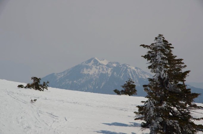 雪の稜線の向こうには、燧ヶ岳がどっしりと聳えたっている