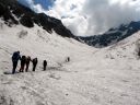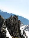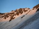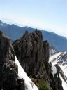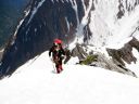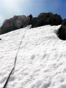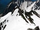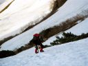 | 【山行記録】 北穂岳東稜に登攀してきました。去年に比べ、全体に雪が少なく、雪と岩のミックスになってしまいました。雪質も悪く岩の周りの雪はすぐ崩れ落ち、とても気を遣いました。 (4日) 小梨平周辺か早くも猿の大群に会う。襲うこともなくかわいい。ここから見える屏風岩には誰ものぼっていない。本谷澤からはアイゼン装着。今年は雪解けが早く、岩が半分ぐらい出ており、歩きにくく、速度が上がりません。やがて、去年デブリでゴロゴしていた雪の塊の道も、今年は形跡もなく、平らで歩きやすい。何パーテイか追い越し、やがていつものきつい上り。ここが頑張りどころだ。やっと涸沢小屋着。今夜は7名の宿泊客のみ。 (5日) 4:00小屋発。小屋の後ろから、きつい上りをアイゼンを効かせ、ヘッデンをつけ、もくもくと登る。取りつきまでの急斜面を、朝一番はさすがにきつく息が上がる。 取りつきまで来る。ここからの高度感溢れる岩稜登攀は満足感でいっぱい!特に、ゴジラの背は高度感に慣れて来たところなので、楽しかった。いったん外に放り出されるよう感じになる懸垂下降点もあり、これも楽しい。 北穂岳登頂後は腐った雪の、斜度50度はあろうかという北穂高沢を延々と涸澤小屋までおりなければなりません。 腐った雪はアイゼンが効かず、ずるずると滑ります。一歩一歩、慎重にあるいた。慎重し過ぎて今度は、速度が上がりません。 やっと涸澤小屋に着き、アイゼンを外し、すぐにまた、上高地へと向かいました。横尾に着いた時点で、上高地の最終バスには間に合わないことが分かったので、横尾山荘泊にしました。 横尾山荘の真新しいお風呂につかりながら、二日間天候に恵まれ登攀できたことで、幸せな気分になりました。 翌6日 上高地まで下山。 記N/K |