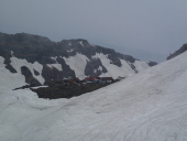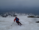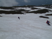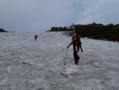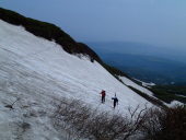 | 【コメント】 今スキーシーズンの最後は月山か鳥海山、どちらにするか・・、同行者の 一人が初めてということで鳥海山に決定、酒飲み3名での山行となりました。 (6日):東北道から山形道へ、途中で見える月山はまだ十分に滑れそうです。 酒田で山形の銘酒を買い込み、象潟で海と山の幸を仕入れ、私自身は4度目 になりますが、秋田県側、矢島口の祓川ヒュッテに夕方到着しました。 このヒュッテ、平日は管理人が不在でこの日は他に泊まる人も無く、備え 付けの鍋や器を使用させて頂き、蕎麦打ち職人Sさんの山海料理と大吟醸・羽前白梅での趣のある楽しい夕餉となりました。 (7日):朝から晴れ間が広がり絶好の登山日和です。本日の宿もこのヒュッテ のため、ゆっくり出発しました。雪は例年並み以上にあり、すぐシール登行 にして1時間半程で七ツ釜避難小屋着、さすがに頂上直下の急斜面のシール 登行はジグザグになったものの順調に山頂に到着しました。 矢島口からの山頂(七高山)は一等三角点があり、国土地理院関係の仕事 で三角点の設置をされていたIさんは大感激、一等三角点がある山頂は全国で もそんなにはないようです。 山頂付近、雨模様になり急な斜面を一気に滑走しましたが、中ほどあたり から雪面ガタガタの状態でどうにもならず、私のテレマークスキー技術では とても満足には滑りきれない今シーズン最終のスキーとなりました。 ≪情報≫:この祓川ヒュッテは駐車場から3分、70人程泊まれる2階建ての 建物で、平日(電気つかない)は宿泊無料です。しかも厨房は広く 備え付けの什器とプロパンガスが利用できます。 金・土は管理人在で素泊まり一泊1,370円と驚くばかりの料金です。 ・・・それにしても、東北の山と山小屋は素晴らしい!!・・・ (S.A記) |