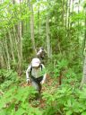 | 藪はますます深くなり、笹を振り分け、枝を掴み、戻り枝が顔に当たり必死です。ストックが木の根の間に入り込み、前に進めず立ち往生。後のNさんからストックをしまうようアドバイスをうけ、ザックのサイドにしまうとストックの先が木の枝に引っかかり、藪の中で大奮闘です。両手で笹の根元を掴み登るが息が切れます。 |
