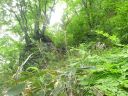 | 薮漕ぎに疲れ果て、メンバーには筋攣りになって止まってしまうものも出た。急斜面の笹を両手に掴んで休む。目の前が明るくなって見上げると薮が乗った岩場になって、左の大岩の間がルートと思われた。笹やゼンマイを掴んで近寄ると、間の溝にトラロープが固定されていた。トラロープと木の根を掴んでよじ登る。メンバーも続く。登った上には再び大岩がのしかかっている。岩の下の窪みにはカモシカの溜め糞があり、その前をまいて左から再びトラロープを掴んでよじ登る。右からの尾根が頭の上に延びるあたりでようやく足を休めることができた。踏み跡は右、中央、左と錯綜とし、目印が見当たらなかった。まず、右を、ついで左、そして中央を偵察してようやく荒海山頂上稜線の上に出ることができた。下で待っているメンバーに声を掛けて、尾根を左に進むと、大きな窪地の高木の幹に太郎山・中三依と記した道標が取り付けてあった。 |