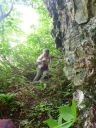 | 頂上稜線から倉掛尾根への下り口は高薮が被さっている上に、踏み跡・水の流れ跡が複数ある。南への流れ跡に迷い込んで登り返し、中央の踏み跡を下って古い白荷造りPEテープが結んであるのを見つけ、一安心した。二段の大岩をトラロープを掴み、所によってはクライムダウンして、全員無事に笹薮急斜面に下ることができた。 |