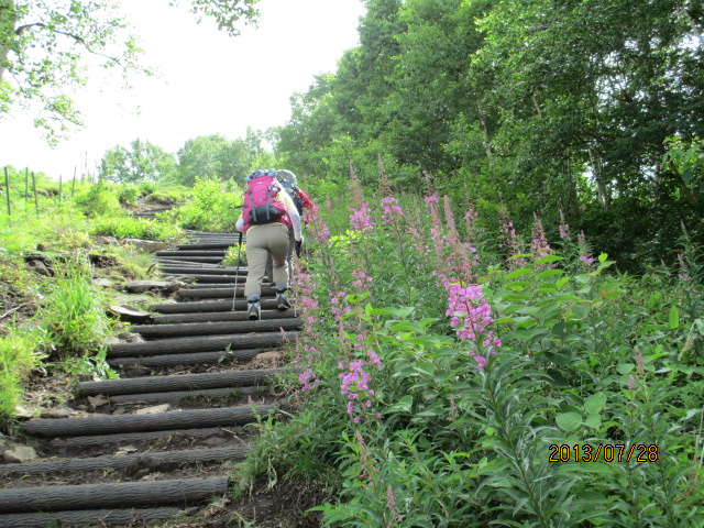 木の階段を登る