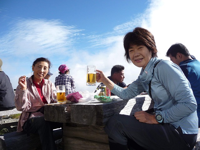 白馬山荘のテラスにて、生ビールがおいしい