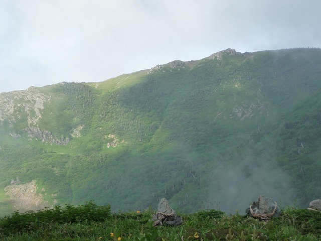 ガスが晴れ、朝日岳のなだらかな山頂が顔を出しました