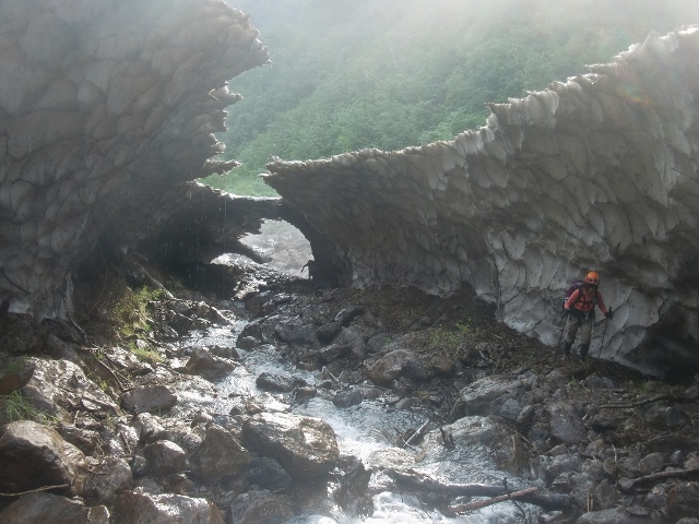 スノーブリッジを一人ずつ通過する