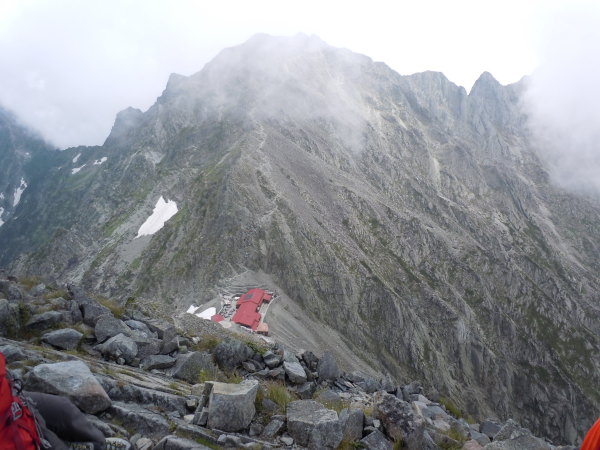 涸沢岳山頂に到着。穂高山荘が眼下に