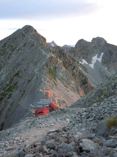 振り向くと北穂高と涸沢岳と穂高山荘が・・