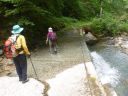 | 電車が、空を雲が覆った下今市を越えて鬼怒川温泉を過ぎるあたりから緑の谷間に青空が広がった。中三依駅からは青空の下に聳える芝草山と荒海山に向かう谷筋がはっきりと見える。先回、途中撤退した栃木県側薮コースだ。そんな思いに浸るまもなく電車は男鹿高原駅を過ぎて会津高原尾瀬口に到着した。 二両連結の電車からホームに殆どの乗客が降りてしまう。9月下旬になっても尾瀬人気はまだまだ衰え知らずだ。行列の先頭に立って駅の出口にでると待ち受けていた旭タクシー(電120-15-1243)の星運転手さんと目が合った。「予約していたIです」、「埼玉のIさん一行3人さんですか」とお互いに確認してタクシーに乗り込んだ。 八総(やそう)鉱山跡に向かう。 星さんは年間50回も荒海山登山口に客を運ぶと言う。先週(09/16)の台風18号直撃のせいで林道の砂利が流れたりして道が荒れているのでどこまで行けるか、「行ける所まで送ります。車庫のある会津田島から30分は掛かるので、その時間を見込んで携帯電話で連絡していただければ帰りも迎えに」とのこと、喜んで予約することとした。 凸凹の砂利林道の脇には穂を出した薄が並んで晩夏の趣が濃い。広葉樹も葉を濃緑から黄緑に色薄くして来ている。林道脇にはポツリポツリと車がとまっていた。八総鉱山跡を過ぎてすぐ前の右手沢側にピンクテープで囲った林道崩落箇所があった。「ここまで」とのことで下車してザックをトランクから下ろした。迎車料金込みの運賃は昭文社登山地図に記してあった額よりはるかに少なく、おまけを貰った子供のように浮いた気分になった。不思議なものだ。 林道はカメバヒキオコシ、アカソ、ツリフネソウ、アキノキリンソウ、キンミズヒキなど秋の花に囲まれている。覗きこんだ右手の沢には清冽な水が青白い滑床岩の上を走って美しい。新しい轍の跡が伸びているのが気になる。その上に幾つも登山靴の跡があった。朝露に濡れた林道を進んでゆくとも左の崖から林道に流れ落ちた木の堆積に出会った。二ヶ所もある。台風18号は帝釈山脈に久しぶりの被害を与えているようだ。水溜り、泥濘や溝を避けつつ、先行者の足跡と「荒海山登山コース」道標の矢印にもお世話になりながら進む。 出会った登山者カード入れはロックが固く、記帳も投函もできずに通過した。林道は右岸から左岸に、再び右に岸に渡った後、沢と同じ水準になる。周りに見える木々も沢筋に多いサワグルミ、トチ、カツラなどに代わった。再び左岸に移って歩むと右手から清冽な流れが小堰堤道を横切る。散歩ならジャブジャブと足を濡らして喜ぶのだろうが、先のある身では登山靴が濡れないように岸の石を選んで渡った。林道が荒海川によって切断されている。石飛渡渉をして左岸の林道に渡るとそこが荒海山登山口であった。 テープや「荒海山登山コース」道標のおかげで登山口は間違えようはない。等高線で940mにある。 荒海川本流を離れて右の小沢を登る。標高960mあたりで、上から地下足袋を履いた作業服姿の男性が下山してきた。YSさんが話しかけると「今朝6時発で、もう下山、先行は2人のグループ」とのことだ。往復4時間半とはインターネットにもそんなコースタイム情報があったが我々はのんびりと最終電車に間に合うように山を楽しもう。駐車台数と登山グループ数とが合わないが、そんなことはどうでもよい。 標高990mあたり小堰堤を越す。沢が一挙に狭くなり、登山路も急坂、石だらけの沢筋になる。小沢二股では間の斜面へ登り南沢の北側斜面を巻く。登山路が沢に合流し、台風で流れ出た枯木が急角度の小沢道を左右から埋め、それを過ぎると固定ロープが下がる泥坂に代わる。切ってあるステップを踏み、ロープを掴んでよじ登った。20〜30mの標高差だが下りの方が心配だ。 風が通る稜線に到着して一休みする。南北に伸びる尾根の標高1170m鞍部にあるちょっとした平場である。ほぼ、1時間に10分休み、間に息継ぎ休みを入れるペースで良さそうだ。 道標に従い南南西へ進む。奥武蔵のような平坦な散歩道が続く。道に落ちたアスナロの黄色葉が目立つ。所々に台風で折れた木が道をふさいでいるが何と言うこともない。 アスナロ大木林を過ぎるとブナ林が出てきた。NUさんが左手にS字に曲がったブナを見つけて「インターネットで紹介されていた腰掛ブナ」ということで座ってみる。このあたりはブナだけでなくアスナロの枝も曲がりくねっている。標高1251m峰を過ぎると左手の木立越に、「あれが荒海山だ」と思えるような峰が出てきた。 正午チャイムが里から聞こえてきた。YSさんを先頭に昼食場所を探しながら歩むが林の中の登山路は細く、暗く、展望もなく、路肩も刈払われた笹の茎が立ちなかなか思う場所が無い。どうにか道標が幹に打ち付けられた針葉樹の大木の下でザックを下ろすことができた。静寂の一言。 昼食を終えて再び静寂な登山道を歩む。標高差が余り無い小ピークを2つ、3つ越してコルに出た。