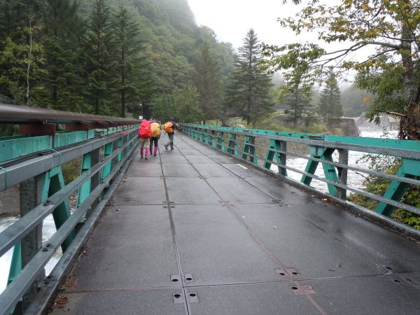 新穂高「恵橋」の架け替え工事のため、仮橋から出発
