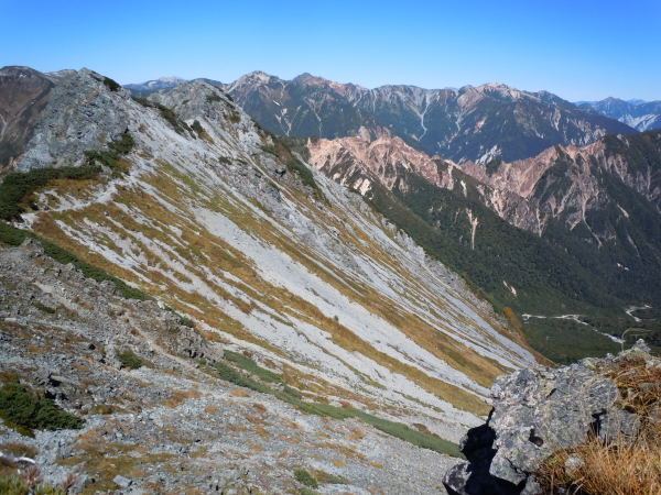 歩いてきた西鎌尾根のトレイルがクッキリ見えます