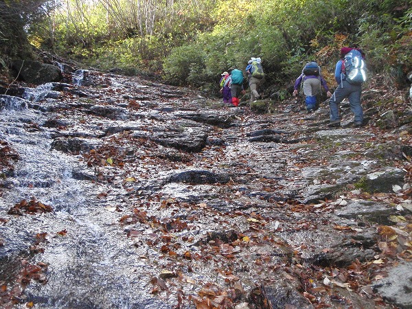 ナメ滝が続き、水流の無い足場を選んで進みます