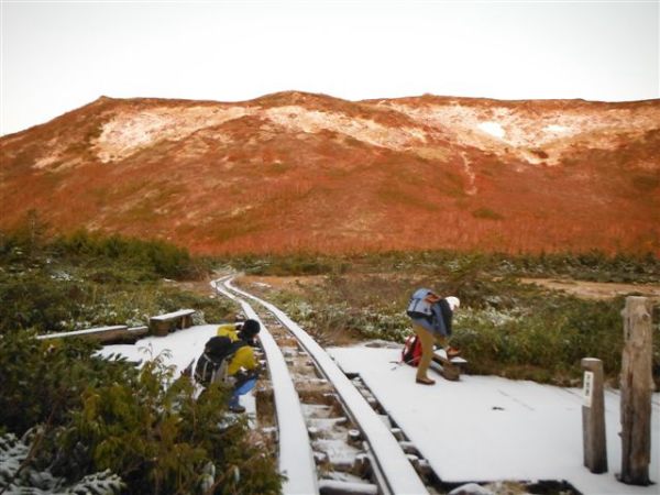 天狗原で靴ひもの締め直し、木道にウッスラと新雪です