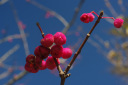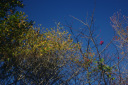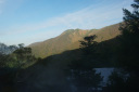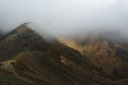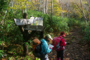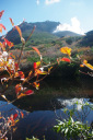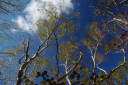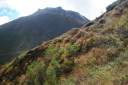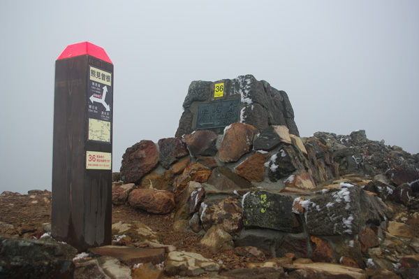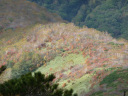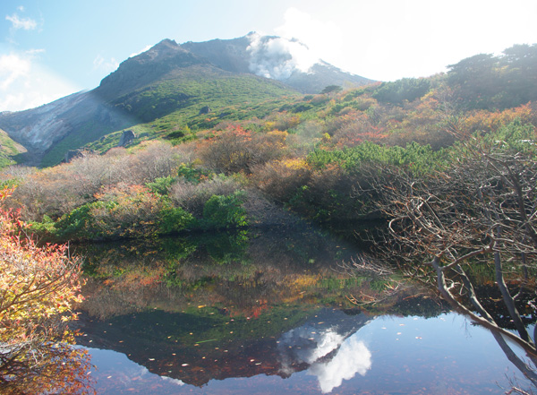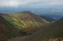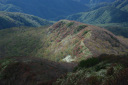 | 【コメント】 「那須の三斗小屋温泉に行こうよ。泊まったことないから。」 「いいね。天気も良いし紅葉もきれいだよ。」 ということで、紅葉と温泉を楽しもうと那須岳に登ってきました。 二日間共秋晴れで快晴無風のはずでしたが、一日目は耐風姿勢の練習にちょうど良い大風の中朝日岳に登れば、岩や草木は真っ白に海老の尻尾を全身にまとい、早くも冬支度。 三斗小屋温泉への稜線では風も収まり、流れる雲の間に間に秋の陽が錦の山肌をスポットライトのように照らしながら、あちらの峰からこちらの谷へと渡っていく様は、息を呑む程の素晴らしさでした。 三斗小屋温泉、煙草屋では紅葉の山々を眺めながら露天風呂を楽しみました。 二日目は穏やかな天気の下、那須の紅葉の名所、姥ヶ平から沼原湿原へときれいな雑木林を下り、更に板室温泉に下りましたが、その途中、分岐に乙女の滝に回らず板室温泉へ直接行ける登山道の新しく立派な道標があり、ここを行こうと足を踏み入れました。前半は良く整備され歩きやすい道、後半は赤いテープを探しながらの急坂と渡渉で大変でしたがなかなかおもしろい道でした。ただ、ファミリーハイキングでこの道は無理かもしれません。 沼原湿原から乙女の滝回りで板室温泉に下る際には注意されて下さい。 (記:M/U) 予報では既に通過済みのはずだった台風の余韻が幾分残っていて茶臼岳山頂は時折霧雨が流れ初冬の気配も。 流れる雲と陽光と秋の粧いの山肌が織り成す風景は変化に富んで一段と美しい姿を見せてくれました。 峠の茶屋避難小屋はそんな風から一時の安らぎをくれるオアシス。 恵比寿大黒岩の下を通り朝日岳への鎖・岩場を通る頃がこの日の風の山場・一瞬進むのを躊躇したが好転に賭け 朝日岳の肩に出ると、赤いナナカマド実にエビの尻尾が発達し草紅葉には霧氷をまとった美しい光景が待っていた。 熊見曽根を越えて隠居倉に着く頃には穏やかな天候に変わりとても美しい山の姿を楽しめました。 三斗小屋温泉煙草屋旅館に泊まりましたが、食事は太鼓の合図・赤漆の膳での食事は伝統の趣を感じる、 露天風呂から眺める紅葉の大倉山の嶺・天上に煌く宵の明星の風景・素晴らしい光景だった、勿論内湯も源泉賭け流しで一日の疲れを癒すにはもんくなし。 温泉から沼原(ぬまっぱら)湿原に下る道は良く下草が刈られ静かな林に包まれたプロムナードの雰囲気。 途中から那須の紅葉のメッカ?姥ヶ平へ。初めて訪れる裏茶臼の光景に魅了された。ひょうたん池に映る茶臼岳と力強く昇る噴煙の姿と錦の粧いの山裾の広がりに暫し見とれ、離れがたい光景に出会えました。 山道は少しずつ下るとともに樹相が変化し、青空に力強い岳樺の姿、間もなく黄葉にの唐松の林の間から眺められる 大倉山・三倉山・南月山・白笹山・・・が呼んでいます、何時かの日来てみたい山々となりました。 沼原(ぬまっぱら)湿原は木道が良く整備され周囲の山々の眺め、初夏の頃には一面のニッコウキスゲの風景と山行でもドライブでも楽しめそうな自然満載のスポットでした。是非再訪したいところです。 茶臼岳から日の出平・南月山・白笹山を越えてくるコースも楽しめそうです。 (記:T/M) |
