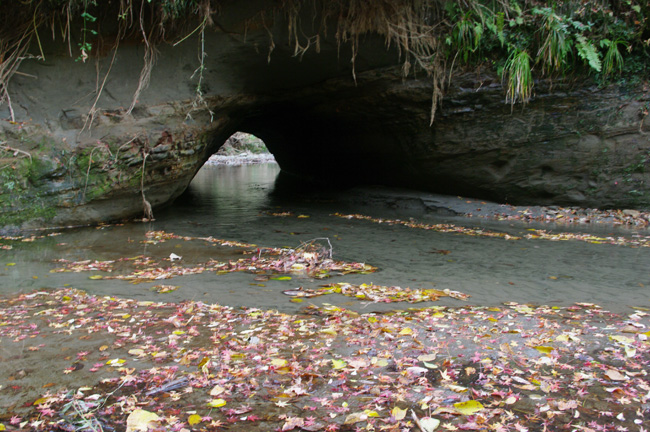 清らかな湧き水も力を増して崖を刳り貫いて流れを変えます。