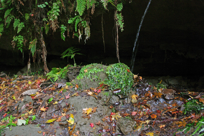 緑滴る苔と湧き水、もみじが重なり、美しい光景です。