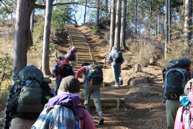 日の出山へ最後の登り 土のえぐれた歩きにくい階段が続く