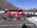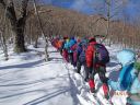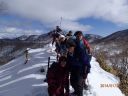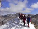 | 【コメント】 6時過ぎ新座駅を出発。天気快晴、気温が高く風は微風。 すばらしい冬山登山日和になりました。 コースを変更して鍬柄岳から鈴が岳を目指して出発。踏み跡がしっかり付いていて 先行した登山者がいるようです。 しばらく行くと木立の中で口笛を吹いている人がいる? すると黒い鳥がすぐそばに飛んできました。『うそ』です。 うそ君が我々 23名を歓迎して歌って出迎えてくれました。 なんて透きとおった綺麗な歌声でしょう、感激です。 途中9人のパーティーと2人連れの登山者と出会いました。 鍬柄岳山頂からは大沼、地蔵岳、上州武尊山が見えました。 やせ尾根を歩き進むとやっとこんもりとした可愛い三角おむすびに似た 鈴が岳が見えてきました。 いったん下ってから登り返し岩場を登りきると 鈴が岳山頂到着。 ペンギン、しろくま各チームで記念撮影。 好天に恵まれ楽しい冬山登山でした。 記Y,T |