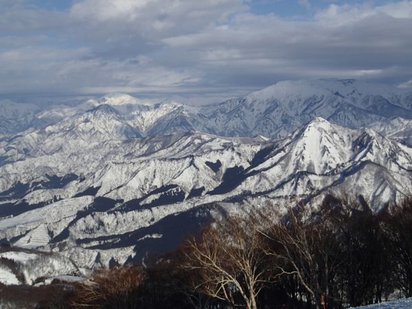 手前右が飯士山、うしろに巻機山、左奥が中ノ岳。
