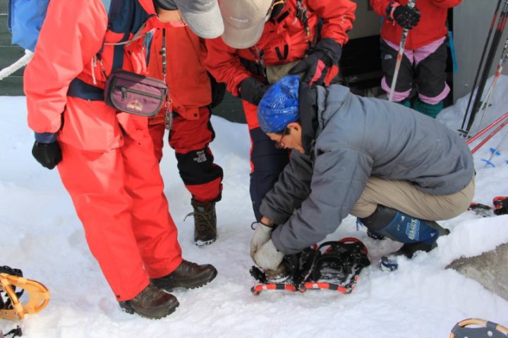 スノーシューの履き方も初心に還ってしっかりと教わる!