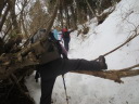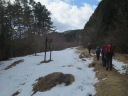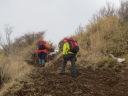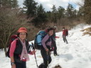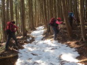 | 【コメント】 埼玉労山女性委員会のメンバー5人で、箱根の明神ヶ岳に登ってきました。電車から見える富士山はとてもき れいだったので、大きな富士山が見られることを期待しながら登山口に行きました。 道了尊までバスで入り、そこから歩き始めましたが、参道は杉の枝が散乱していて、地域の方が掃除をされて いました。もちろん山に登るのは私たち5人だけでした。 しばらくはまわりの杉並木を眺めながら進みましたが、進むにつれて雪がたくさん現れ、時々「ズボッ」ともぐっ たりしながら登りました。 海が見えてきて良い眺めの中を進みましたが、だんだんと雲が多くなってきました。雪 道を歩くのは時間がかかるということがよくわかりました。 明神ヶ岳頂上まであと少しのところで昼食を取り、頂上にようやく着きました。もう13:43でした。楽しみにいてい た富士山は雲の中でした。 これから明星ヶ岳に登り、宮城野橋に下りるには相当時間がかかるということで、予定を変更して、元来た道 了尊に戻ることにしました。 帰りは雪が降ってきたので、カッパを着て下りました。雪景色がきれいでした。 Y/S記 |