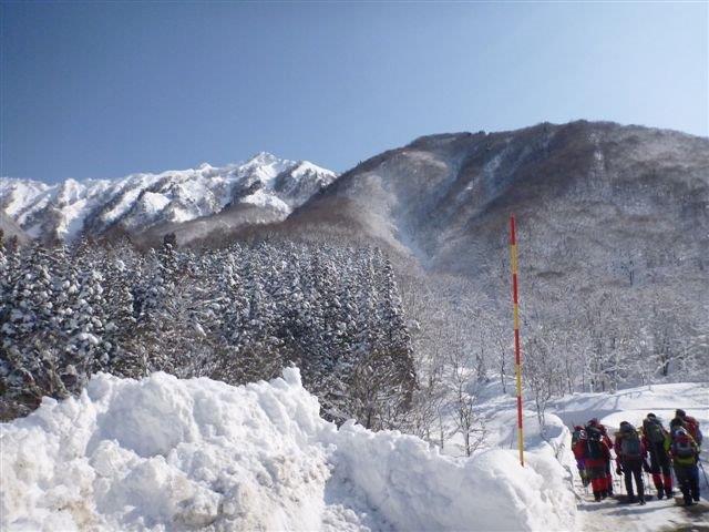 出発!足拍子岳が白銀に輝いている