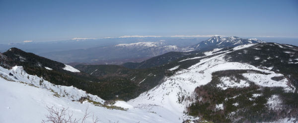 蓼科山から続く北八ヶ岳 奥は左から御嶽、乗鞍、焼岳、北ア、真ん中は霧ヶ峰
