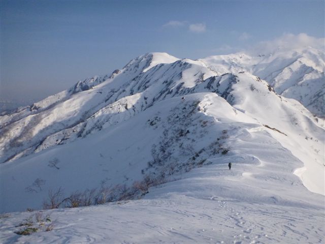 13分岐手前のピークから白銀の石徹白道を進む