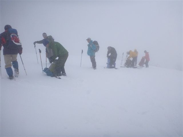 42野伏ケ岳頂上に到着、今日も雲が通過中、登山・スキー・ボード目的の方が多数