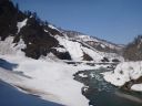 | 谷間にブルーの上大鳥橋が見えた。その上には白く輝く山が見える。毛猛か守門であろうか |