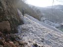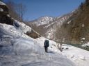 | 軟雪、急斜面の尾根、沢をTKさんを先頭に下った。予想したように尾根末端は崖になって林道に繋がっていた。滑落をしないように雪が落ちた藪を伝ってどうにか林道に下ることができた。見上げると酷い崖尾根を下ったものだと改めて知らされた。電源開発道路は積雪・デブリで埋まり、この先どうなるかと不安が募ったが見ると新しいスキー滑跡が上大鳥橋方向に残っている。重いザックを背負っているがどうにか(安全に)歩けるのではないかと思った。空は快晴、風もなく天候に心配はない |