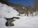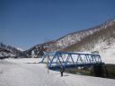 | 上大鳥橋を渡る。これで新潟県魚沼市から福島県桧枝岐村に入ったことになる。発電関係設備あるいは保守のためだろうか建屋がある。豪雪に耐えるためか思いのほか高い。建屋先は広場(夏なら河原か)になっており、発電所遺構も山裾にあった。沢筋の山側末端に近づいた時、突然から小型の鴨が2羽飛び出した。白い目の周り、羽の色から鴛鴦の番と見た。 |