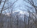 | 尾根にはアップダウンがあるが比較的緩いので白銀の残雪とブナ大木疎林を愛でながら歩む。とはいえ午後の軟雪には閉口した。ブナの木立越しに只見川対岸に前衛の山の上に白く輝く峰が見えてきた。尾根が広くなりテント場にむいた平坦地を探す。イカルの囀りが聞こえる。登り口ではミソサザイが囀っていたが小鳥の多い山だ。 |
