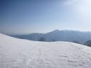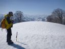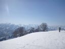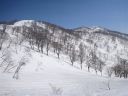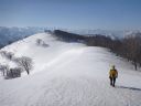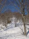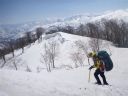 | 主尾根に至る急斜面を登る。目の上には藪筋が出ている。TKさんの踏み跡を利用させていただいているがトラバースには不安がある。右左によれながらどうにか主尾根にたどり着いた。みればスキーの跡がある。どこか、登りやすい取り付き、ルートがあったのか、そんな思いをしながら汗をぬぐった。 |