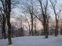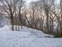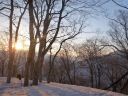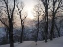 | 夜明け前に起きてテント外に出ると満月が雪面を輝かしていた。気温は1℃で温かいが風がある。テントを撤収してクランポンを装着した。昨日と違って雪に爪がよく利く。雪の上にはブナの殻が多数散乱していた。 |