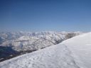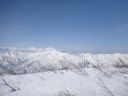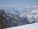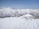 | 標高1395mのピークに到着した。尾根が合流している。風裏の平場に大ザックをデポしてアタックザックに本日の装備を詰めなおす。南を見ると今日の目的地の三羽折の高手、倉前沢山に至る平坦で広い尾根が白く輝き、その先には尾瀬燧ケ岳や平ケ岳が見える。平ケ岳の右手は越後三山だろうか。その手前には村杉沢出合に向かう下山尾根が流れ、さらに右手には毛猛の尾根が見えた。 |