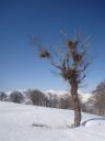 | 荷物をデポした1395mピークから南へは快適な雪上散歩が続く。三羽折の高手から振り返るとブナが雪の上に立ち、青空が澄み切って目から心に沁みこむ。熊棚をいくつもつけた一本のブナを見つけた。周りを見ても他に熊棚はない。雪の上にブナ林から吹き寄せられたブナの実の殻が散らばっている。熊は何でこの木だけを選んだのか答えのない質問を自分にしてみた。 尾根の端の倉前沢山についた。山名標などなにもない。TKさんのGPSで山頂確認をする。少々木々の邪魔はあるが素晴らしい展望だ。登り損ねた会津丸山岳や朝日岳も見えるとTKさんと山座同定を楽しむ。北を振り返れば3番目奥の峰が村杉岳のように思われた。まだまだ先だ。休憩して再びデポ地点まで引き返した。 |