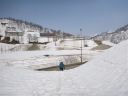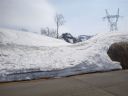 | 白滝沢出合から上大鳥橋までは歩きよい。上大鳥橋で休んで、(我々の?)踏み跡やスキーの跡を辿って初日降下地点まで帰った。降下地点から再び悪場が500m位続くがどうにか抜けることができた。右手を見上げると、スキー場の建物、駐車場の端などが雪斜面の上にある。初日に駐車場からそのまま下ればあんな苦労をしなくて済んだと反省をした。TKさんの提案で電源開発道路を忠実に帰ることにする。強い日差しの下、柔らかい雪に足を取られながら大きな高圧送電線鉄塔近くに来た。右手に回るとスキー場への舗装道路が目の下に出てきた。雪が数mも残って分岐を隠しているのでここがわからなかったのだ |