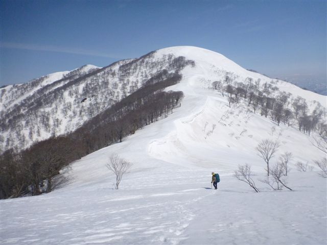 22デポ地点に戻り雪原と雪堤が続く尾根を登る