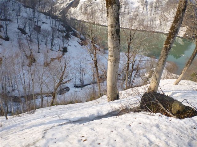 33村杉沢を見下ろすとスノーブリッジ、地形図には人工の橋があるが