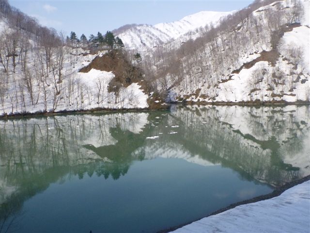 34鏡のようなダム湖には流氷