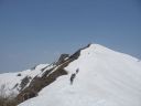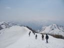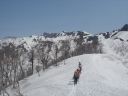 | 【期 日】 2014年4月25日(金)~27日(日) 【メンバー】 TY、ツアー客 【コースタイム】 4/25 集合 金沢駅15時30分⇒一里野温泉16:30(泊) 4/26 ペンション4:00⇒自然観察館4:15→ジライ谷渡渉点4:45→冬瓜平8:30→笈ヶ岳山頂11:30 →シリタカ山→冬瓜山→ジライ谷渡渉点→自然観察館18:00⇒一里野温泉(泊) 4/27 一里野温泉⇒金沢駅→霞ヶ関駅 【コメント】 4月26日早朝、登山口となる自然観察館を出発。 1200m位までは、雪も少なかったが、その後は完全な雪上歩行であった。 行きは、冬瓜山とシリタカ山の山腹を歩いた。冬瓜平に到着。すでに歩行時間4時間半。 ここから見る笈ヶ岳が綺麗だった。 雪崩のデブリのある場所を横切り、尾根に乗った。一度下り主稜右端に登り返すと主稜に取り着いた。 主稜を歩く。最初の雪面・2回目の雪面・3回目の雪面を登ると山頂に到着した。 山頂からの展望を楽しんだ後、直下にもどり休憩をした。ここから見た白山が美しかった。 その後、雪庇に注意しながら下山開始。シリタカ山と冬瓜山の山腹を歩いた。 雪、藪、痩せ尾根の難路であった。 やっとのことで、観察館に到着。ほっとした。 TY記 |