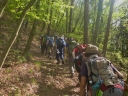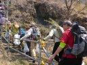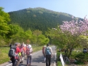 | 【コメント】 晴天に恵まれ埼玉労山の仲間59名の参加で2台のバスに分乗し出発。(新座10名) 交通の流れもスムーズで、開会式に参加、主催者の挨拶、今日の予定、諸注意等を聞き、植樹地へ の移動、急な階段を900段以上登った所で、穴を掘る人、苗木を植える人でスムーズに作業を 終了。 緑の山にはまだまだ年数が掛かり、地道な作業が必要な事と痛感。総勢の参加者は26日800名 /27日800名との事で、27日の植樹は6種類でした。(グミ、サワグルミ、イロハモミジ、 ウリハダカエデ、コハウチカエデ、リョウブ) この植樹デ-で今までの18年間事故は0との事です。桜が満開の銅親水公園での昼食、美味しい 豚汁を頂きながら、時折桜の花びらが舞い落ち、至福の一時でした。 午後の目的は荒神山への山行、登山道にはウワズミザクラ、エイザンスミレ、カタクリ等春の花々 そして水沼温泉での入浴。 |