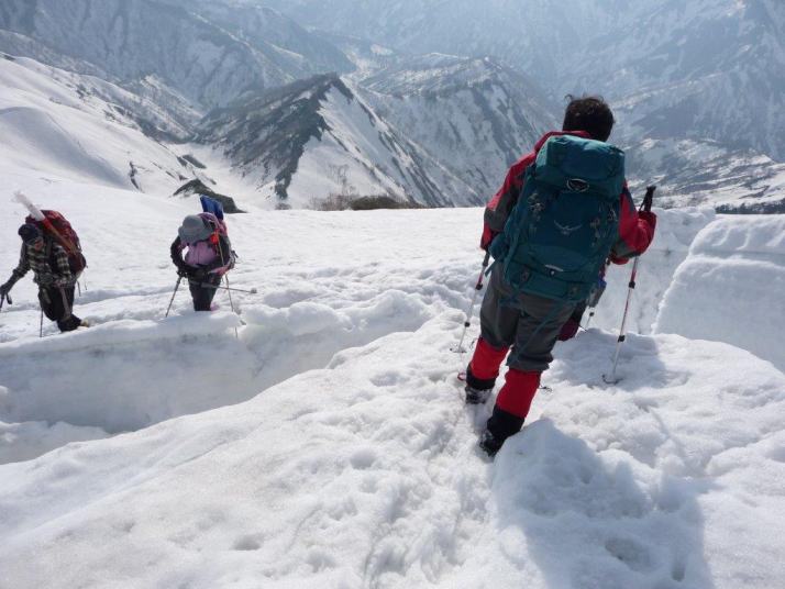 前駒のクレバスを一人ずつ慎重に通過