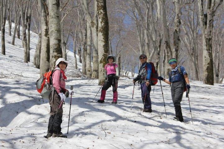 残雪とブナ林と五月晴れの青空の中で