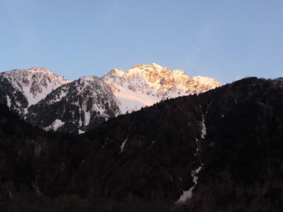 前穂が朝日に輝いていた