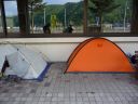 | <1日目> 久しぶりのスキーであることや今シーズン最後のスキーであることで不安と期待の混じった出発。 リーダーKさんのかっとびの運転で東北自動車道をスイスイと、夕方には寒河江ICから一般道に下りる。 途中、立ち寄り湯を探しつつ道の駅にしかわまで行く。 途中から小雨交じりの天気になり、軒下にテントを張れる場所を探す。 道の駅にしかわは温泉が隣接されていて一夜を過ごすには丁度いい場所であった。 |